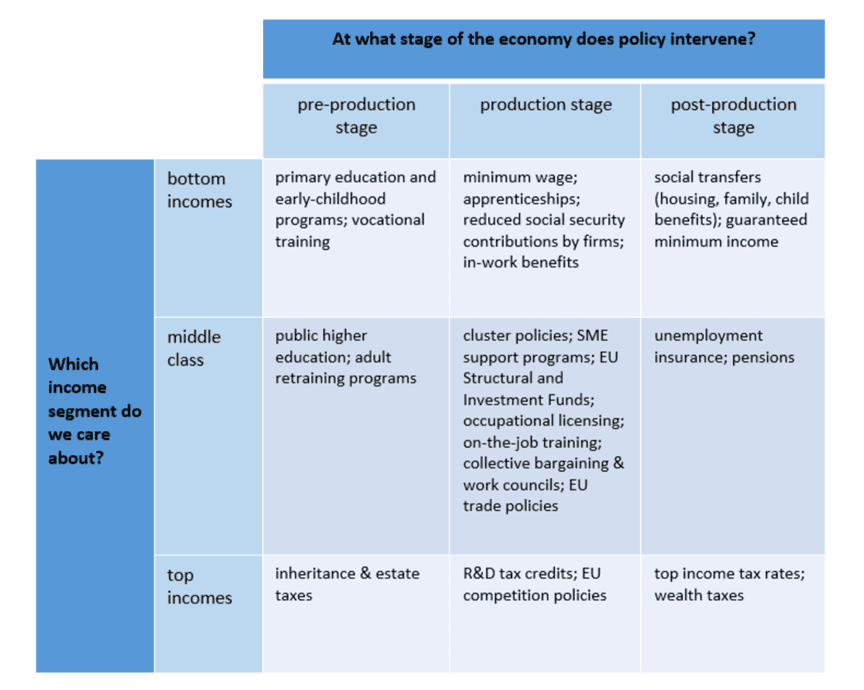 Second, one can think about the stage at which the intervention takes place: pre-redistribution policies directly influence how markets work and can usefully be split into pre-production policies and ‘production policies. Pre-production policies shape the endowments of individuals that they bring to the labour market, and their opportunities. Production stage policies influence the functioning of the labour market, including firms’ decisions. Post-production policies are ex post redistribution policies – that is, government transfers or progressive taxation.