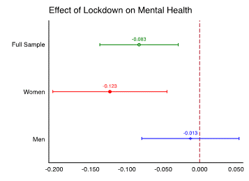 Their analysis of geographically representative survey data collected in the early months of the pandemic reveals that by mid-April, there had been a large worsening in mental health in US states that had ‘stay-at-home’ orders in place compared with states that had not introduced official lockdowns. The negative effect of state-wide stay-at-home measures on mental health was driven entirely by women.