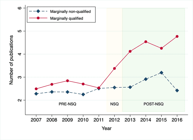 Figure 1: Year-by-year effect of the National Scientific Qualification (NSQ) on the number of publications.