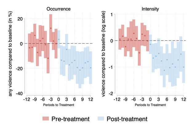 Once the comprehensive agreement is signed, one sees how the blue bars drop below zero, showing that both the occurrence and intensity of violence drop for countries with comprehensive agreements. Moreover, the reduction in violence is lasting.
